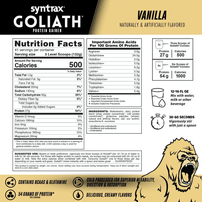 No es un ganador común. Goliath combina proteínas de suero y caseína micelar para crecimiento muscular real. Con carbohidratos complejos, baja grasa y sabor premium, nutre y recupera tu cuerpo desde la primera toma.